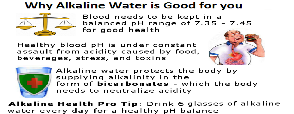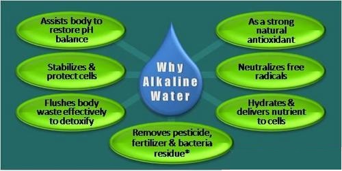 1) Detoxify : Detoxify your body by removing normal acidic waste products accumulated daily, plus remove toxins accumulated in your body from your environment, stress, unnatural foods and from the normal process of aging. Acid wastes/toxins collected in the body can lead to more serious health conditions. Drinking alkaline water daily can neutralize the acidity and wash acid wastes/toxins from cells and tissues.2) Alkalize Your Body(Supplies Bicarbonate) : There is one very effective method to replenish bicarbonate to the blood: “Drink high pH alkaline water”. The more alkaline water we drink, the more hydrochloric acid is produced. This results in more bicarbonate in the bloodstream because of the higher water pH of Alkaline Water. Alkaline water helps balance the body’s pH, which tends to be acidic because of our high acid food diet, stress and exposure to environmental toxins such as smog etc. Alkalize your body pH from acidic to alkaline pH, because cancer and many other illnesses cannot live in an alkaline environment. Most experts agree that bad cells can’t live in high pH(Alkaline) body. Alkaline is the “normal” state of healthy persons. 3) Hydrate : This is basic to maintain or regain optimum health. Alkaline water will more hydrate your body becoz alkaline water filter forms your water into micro clusters that are more easily absorbed at the cellular levels thus “Super Hydrating” your body. 4) Antioxidant/Oxygenate : Oxidation is a natural process that happens to everyone. As you age, your body tissues suffer from oxidative stress due to the process of oxidation. Oxidation is a chemical reaction that transfers electrons from a substance to an oxidizing agent(oxidant). In human body, Oxidation occurs when molecules within our body lose electrons to electrically-charged molecules of oxygen in our blood stream. These electrically charged oxygen molecules are free radicals(oxidant) and they have the potential to cause damage to cellular DNA. These radicals can start chain reactions. When the chain reaction occurs in a cell, it can cause damage or death to the cell. Over time, the damage can become irreversible and lead to disease. Rust on metal or decay in foods like the browning of a cut apple is an example of oxidation. Free radicals in our body are oxidants and their ability to oxidize cells is eliminated or reduced by an antioxidant. An antioxidant is a molecule that inhibits the oxidation of other molecules as it has the ability to donate electrons. Antioxidants terminate these chain reactions by removing free radical intermediates, and inhibit other oxidation reactions. They do this by being oxidized themselves, so antioxidants are often reducing agents. Alkaline water acts as an antioxidant because alkaline water has the ability to give up electrons, It can effectively neutralize and block free-radical damage to the body. Alkaline water seeks out free radicals and converts them into oxygen which our body can use for energy production and tissue oxygenation. Cancer and most other illnesses cannot survive in an oxygenated, alkaline environment. 5) Reduces ORP(Oxidation Reduction Potential) : Oxidation-reduction potential is a measurement that indicates the degree to which a substance is capable of oxidizing or reducing another substance. So in a sense, it determines what’s an oxidant or an anti-oxidant. ORP is measured in mV(millivolts). A Positive ORP charge (+ mV) indicates the ability to gain electrons means the substance is an oxidant(The higher the reading, the more oxidizing it is) & a Negative ORP charge (- mV) indicates the ability to donate electrons means the substance is an anti-oxidant(The lower the reading, the more anti-oxidizing it is) which is healthier for your body. According to author Ray Kurzweil( member of the National Inventors of Hall of Fame), Alkaline Water has extended benefits beyond increasing the pH of water. He states that the Oxidation Reduction Potential (ORP) is the most important benefit of Alkaline Water. The Oxidation Reduction Potential (ORP) reading is an indicator of how bio-available and bio-absorbable a product will be in your body. The lower the reading below 0 millivolts (mV), the more ions are available to assist with your body's metabolic functions. A very high negative ORP is desirable because it is very useful for attacking dangerous free radicals and stops them from harming healthy cells in the body.